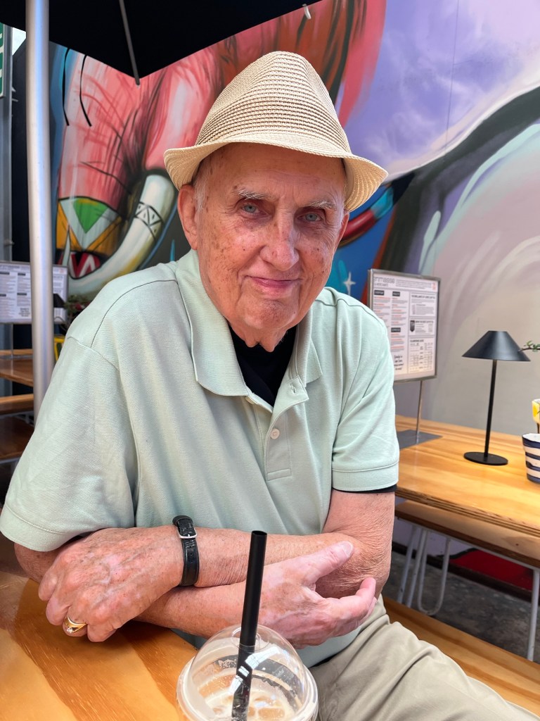 We both had iced lattes and later split a grilled cheddar, tomato and pesto sandwich.