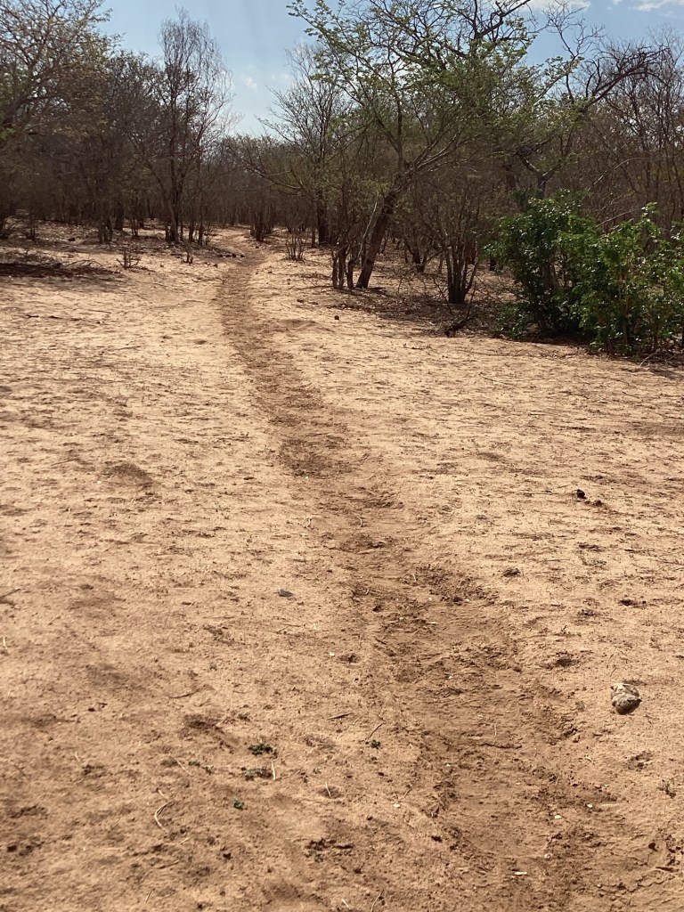 This is part of the so-called “elephant highway” that takes the large herds to and from the Chobe River. Not only is it wide, long and heavily traveled the are huge piles of elephant dung all along the way like road signs.