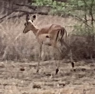 On the way back to the rendezvous area we spotted two white rhinos (white at another time of year) guarded against poachers by two armed game rangers. The,rangers have the right to kill poachers on site. The poachers, who kill elephants and rhinos only for their tusks and horns, (considered an aphrodisiac in the Far East) have decimated the rhinos herds in southern Africa. This pair was imported from South Africa to repopulate the species in Zimbabwe.